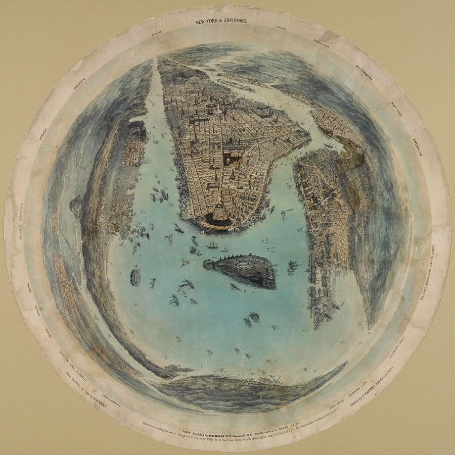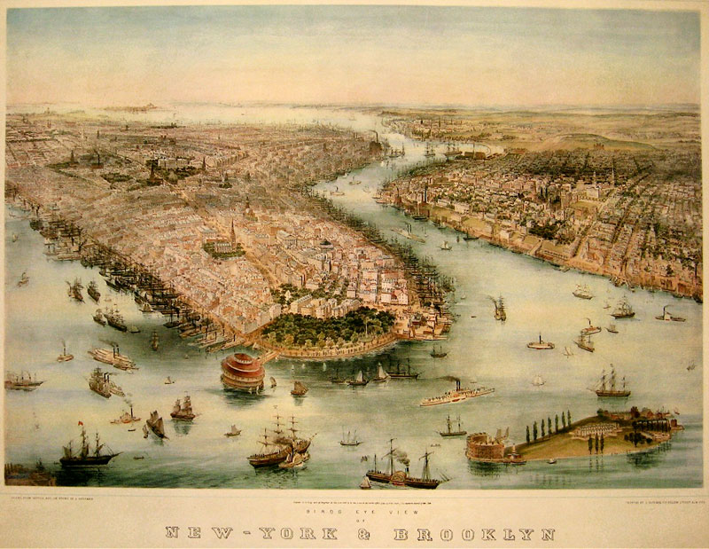 1851: John Bachman produced a number of Manhattan views, including this hand-colored lithograph, “Birds Eye View of New-York & Brooklyn,” and the 1855 and 1859 images below. In this one, note that from the green park at the tip of Manhattan, a bridge leads to Castle Garden, the circular building. Compare that to the next image four years later. [New York Metropolitan Museum of Art]