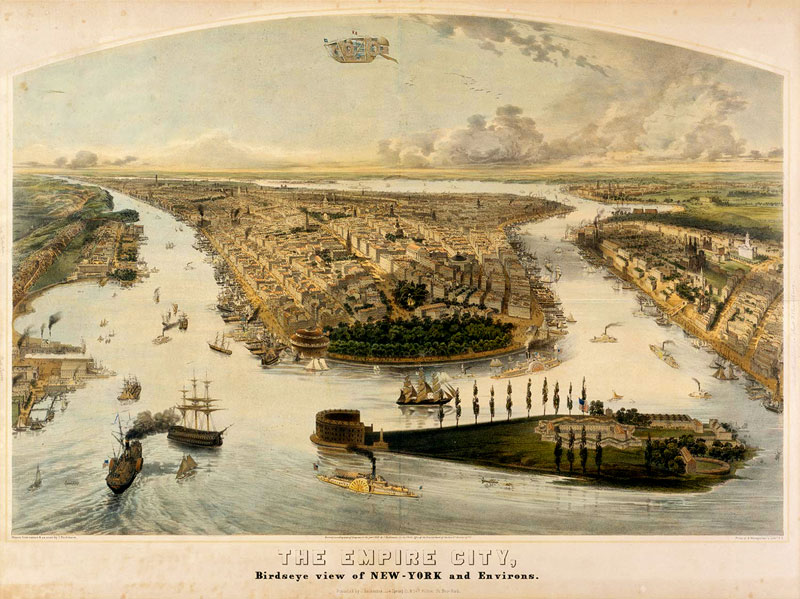 1855: In Bachman’s “The Empire City, Birdseye View of NEW-YORK and Environs, the shoreline of the Park extends to hit Castle Garden, with only half of the circular building extending into the water. This presumably reflects one of the many times Manhattan’s shoreline has been extended with landfill. Today Castle Garden sits in the middle of Battery Park, far from the shoreline. [New York Metropolitan Museum of Art]