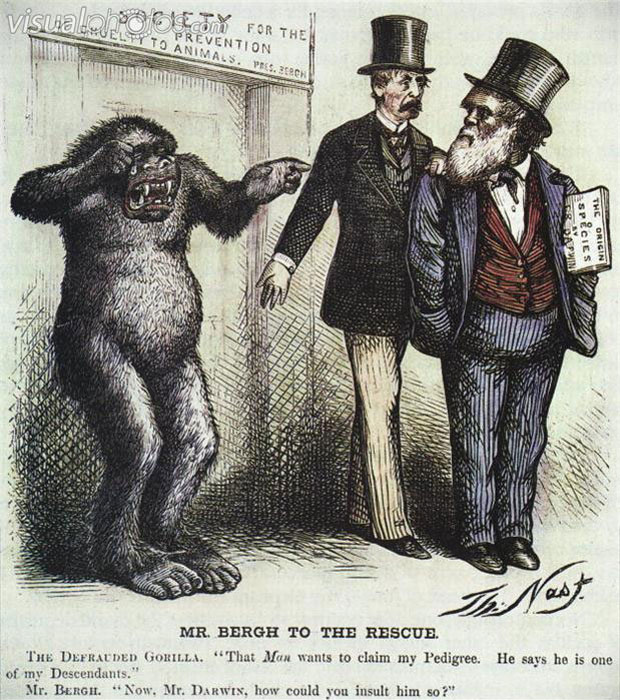 Thomas Nast's views on Charles Darwin and his theory of evolution and Henry Bergh, founder of the Society for the Prevention of Cruelty to Animals